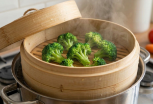 가장 추천하는 최고의 방법은 바로 찜기를 이용해 찌는 것입니다. 브로콜리가 끓는 물에 직접 닿지 않아 수용성 비타민(비타민C, 엽산 등)의 손실을 막을 수 있고, 미로시나아제 효소의 파괴를 최소화할 수 있습니다.